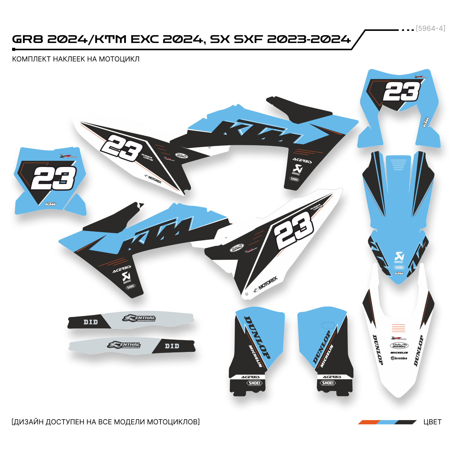 Комплект наклеек для мотоцикла KTM 250 - 450 EXC 2024 SX SXF 2023-2024. Этот дизайн доступен на все модели мотоциклов.